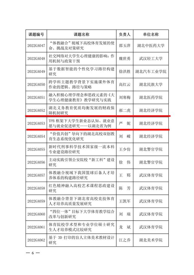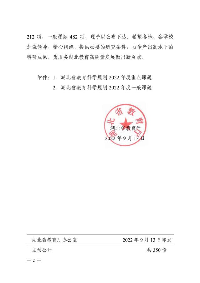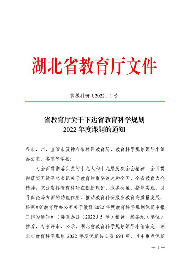 近日,湖北省教育厅发布《省教育厅关于下达省教育科学规划2022年度课题的通知》(鄂教科研〔2022〕1号),共立项课题694项,其中重点课题482项, 一般课题212项。公司7个项目获批立项,其中重点项目3项,一般项目4项。公司郝二虎、严妮老师获2022年度湖北省教育科学规划课题重点立项。