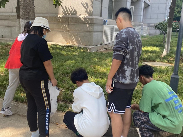 图为新生正在学校草坪清理垃圾。通讯员 王家煜 供图