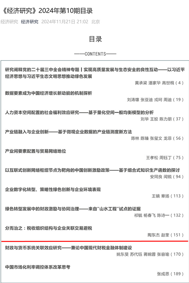 近日,太阳成集团tyc7111cc再传捷报。学院副经理、湖北地方税收研究中心研究员陶东杰副教授作为第一作者与华中科技大学管理学院赵奎副教授合作完成的学术论文《分而治之:税收组织结构与企业关联交易避税》,在中文顶级期刊《经济研究》2024年第10期正式发表。这是公司以“深化税收征管改革”为主题开展的系列研究取得的又一重要成果。