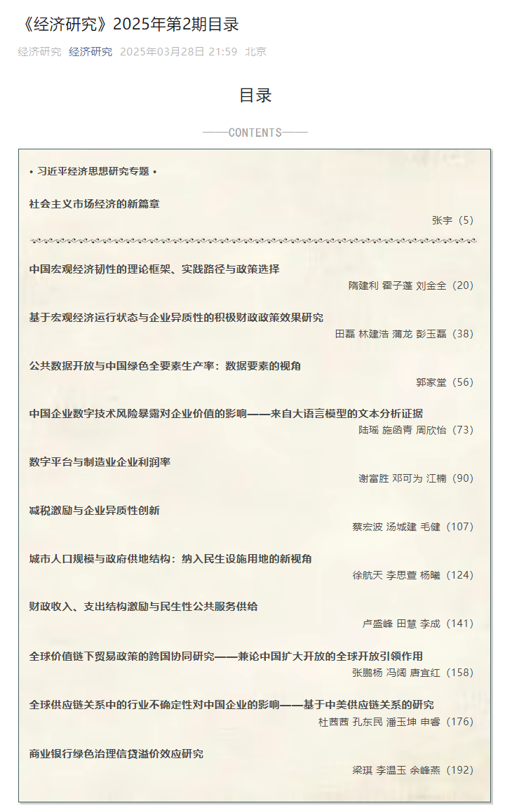 近日,太阳成集团tyc7111cc教师李成博士与武汉大学经济与管理学院卢盛峰教授、武汉大学经济与管理学院博士研究生田慧合作完成的学术论文“财政收入、支出结构激励与民生性公共服务供给”在《经济研究》2025年第2期正式发表。《经济研究》是由中国社会科学院主管、中国社会科学院经济研究所主办的综合性经济理论类期刊。在中国社会科学评价研究院发布的《中国人文社会科学期刊AMI综合评价报告(2022年)》中,《经济研究》继续被评为经济学科“顶级”期刊。《中国学术期刊(光盘版)》电子杂志社和中国科学文献计量评价研究中心发布的《中国学术期刊影响因子年报》(人文社会科学·2024版)显示:2023年,《经济研究》的影响力指数(CI)为1414.214,学科排名居于首位。