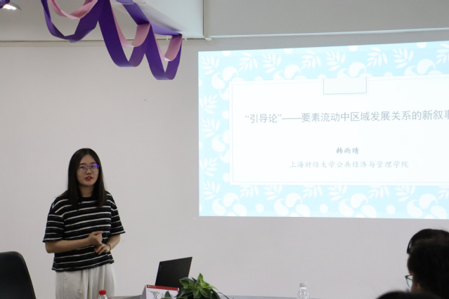 四位青年博士就所研究的领域分别做了主旨演讲。上海财经大学公共经济与管理学院韩雨晴博士汇报了论文《“引导论”——要素流动中区域发展关系的新叙事》。她从要素聚集的原因和结果、户籍制度的性质和目的、要素聚集和合理人口流动规模、央地关系和区域平衡政策等四个方面对“禀赋论”与“引导论”进行了对比分析。进一步地,在构建理论模型的基础上,她发现户籍(公共服务分担比例)与要素投入是一个“拉弗曲线”关系,随着要素流动障碍减少,中央与地方政府目标从一致走向分化,引致政策从集聚导向转为全国统一大市场下导向。