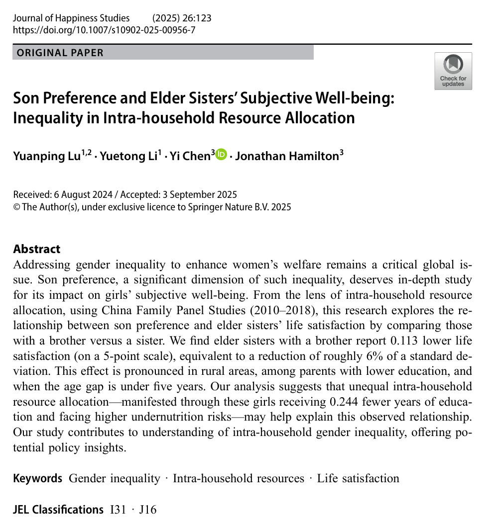 近日,公司陈祎老师、汉密尔顿教授与中南财经政法大学财政税务学院鲁元平教授和博士研究生李玥彤的合作论文“Son Preference and Elder Sisters’ Subjective Well-being: Inequality in Intra-household Resource Allocation” 在幸福经济学领域国际权威期刊Journal of Happiness Studies正式发表。陈祎老师为通讯作者。本论文是公司国际化科研合作的重要成果。