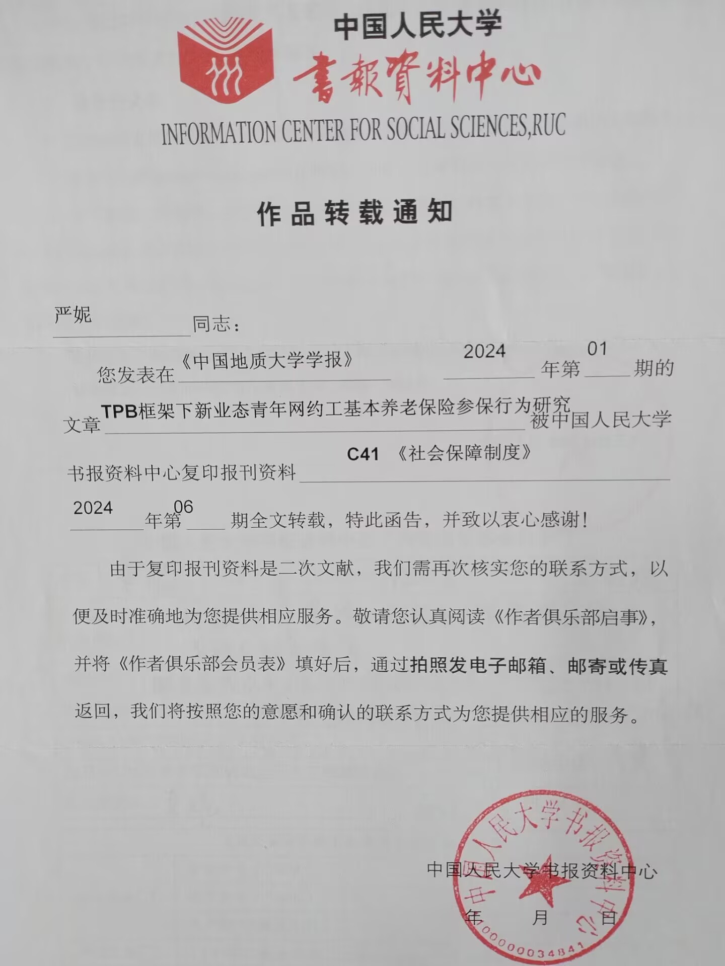公司严妮、任立等老师合作完成的学术论文《TPB 框架下新业态青年网约工基本养老保险参保行为研究——基于问卷调查的微观实证》,于2024年6月被中国人民大学书报资料中心《社会保障制度》全文转载。人大复印资料是由中国人民大学主办、国内人文社会科学领域极具权威性的“二次文献转载体系”,其核心功能是筛选、浓缩、传播各学科领域的高质量研究成果,是人文社科领域对“高质量研究”的官方认可。该论文原载于《中国地质大学学报(社会科学版)》2024年第1期,此次转载充分体现了研究成果在社会保障领域的学术价值与实践参考意义。