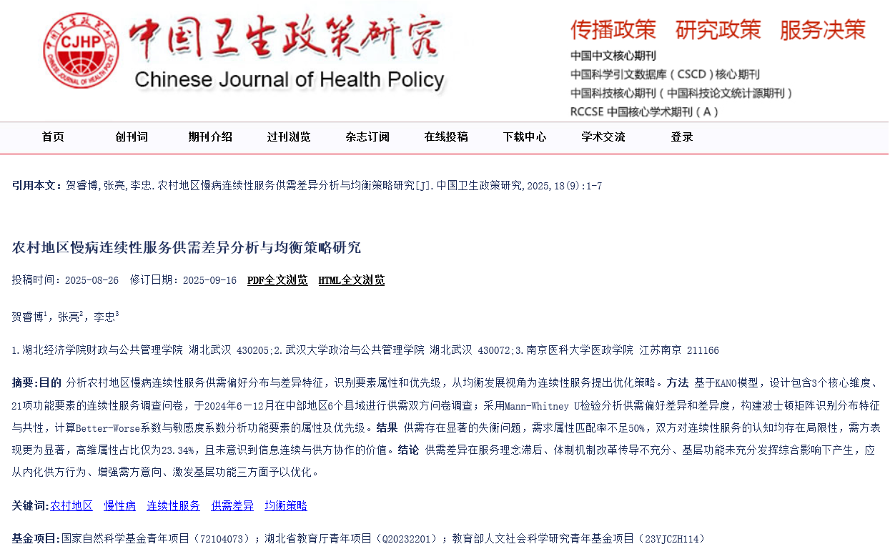 近日,公司贺睿博老师与武汉大学张亮教授、南京医科大学李忠副教授的合作论文《农村地区慢病连续性服务供需差异分析与均衡策略研究》发表于国内卫生政策与管理知名期刊《中国卫生政策研究》(CSCD核心)。该论文系贺睿博老师国家自然科学基金项目“基于慢病轨迹的县域连续性服务供需均衡分析与优化策略研究”(编号:72104073)研究成果。