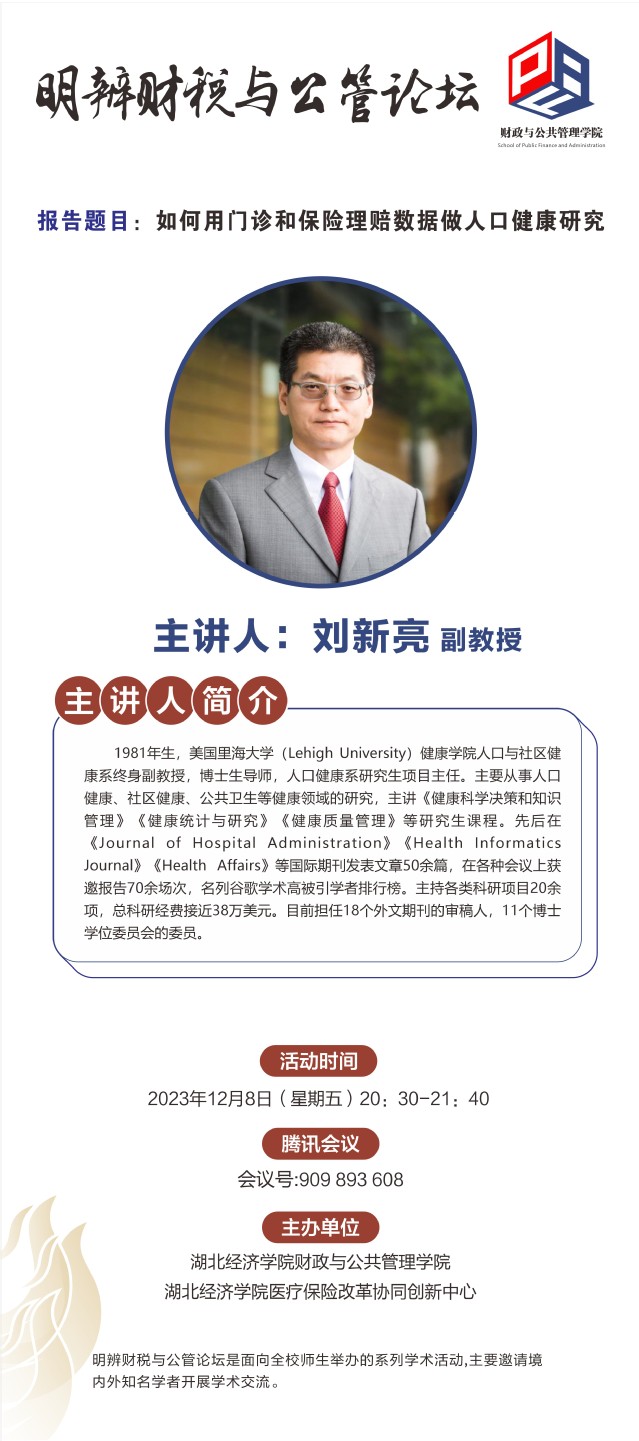12月8日晚上8:30,美国里海大学(Lehigh University)健康学院刘新亮副教授在线上为公司师生做题为“如何用门诊和保险理赔数据做人口健康研究”的讲座,来自公司、中南财经政法大学、华中师范大学的师生共50余人参加了论坛。论坛由医疗保险改革协同创新中心袁妙彧主任主持。